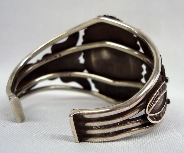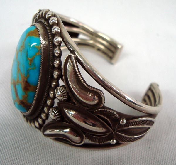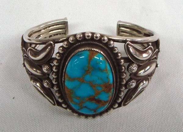 Native American Navajo Sterling Turquoise Bracelet - Rick Martinez. Large oval turquoise cabochon set in sterling. Stamped on inside ''Martinez'' for artist Rick Martinez and ''Sterling'' and ''Navajo''. Measures 6-1/8'' inside including opening and 1-1/2'' wide. The stone is 1-3/8''x7/8''.