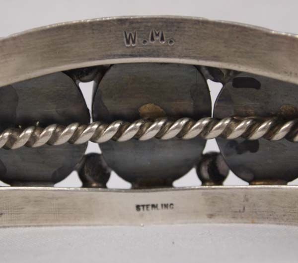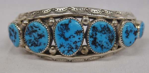 Navajo Sterling Silver Kingman Turquoise Bracelet - William Manygoats, inside measures 7.5'' which includes opening x 1.25'', features 7 graduated sawtooth bezel set Kingman Turquoise cabochons with the largest measuring .75'' x 5/8'', traditional Navajo setting of silver bead accents and stunning hand stamped edges, triple band bracelet, Talk about a work of art...this is it!, 88.54g in total wt.