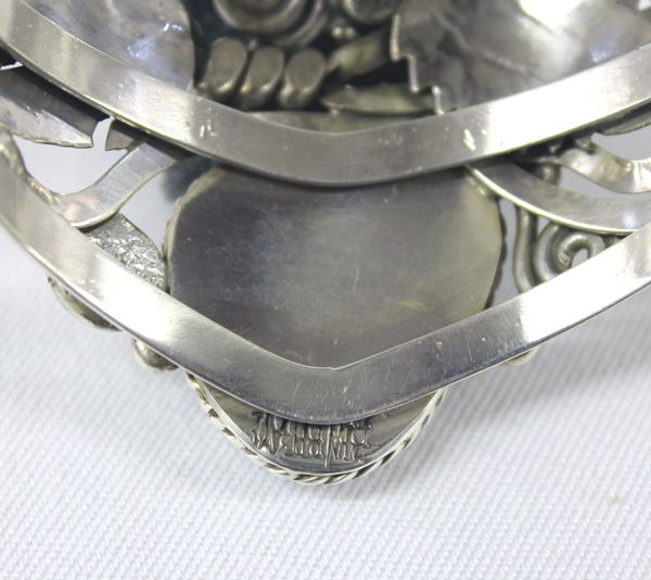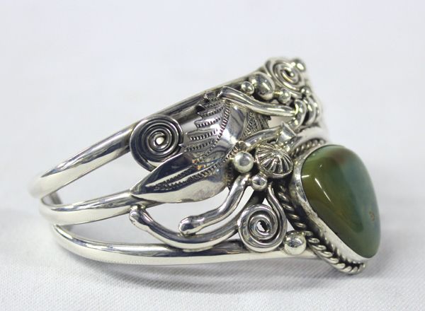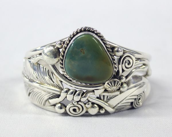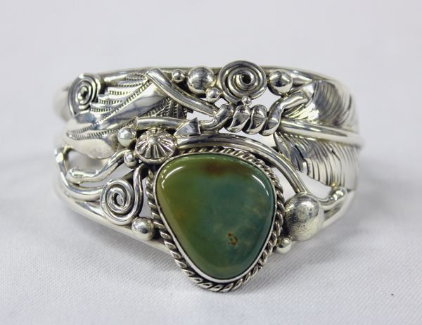 Navajo Sterling & Turquoise Bracelet by Begay. Handsome triple banded sterling bracelet with traditional Navajo silverwork of leaves, flowers and beads. The large stone is off-set, giving the piece great eye appeal. It measures 6.25, including opening and is 1.5'' in width. The stone measures .75'' x .75''. It is stamped ''Ben Begay''.
