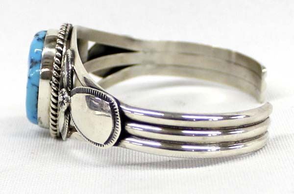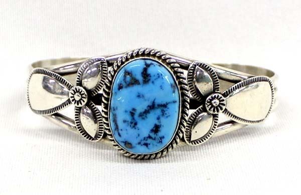 Beautiful Native American Navajo Sterling Turquoise Bracelet by M. Spencer, inside measures 6.5'' x 1''W, turquoise cabochon measures 7/8'' x 5/8'', stamped sterling and hallmarked, 33.12g in total wt.