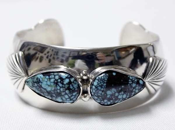Native American Navajo Sterling Silver Turquoise Bracelet by Mike Platero, beautiful all sterling silver bracelet set with rare Landers blue Turquoise cabochons, hallmarked, Platero has been active since 1965, inside measures 6.5'' which includes opening x 1.25'', 48.4g in total wt.