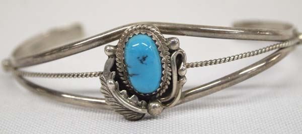 Native American Navajo Sterling Turquoise Bracelet by Robert Becenti, inside measures 7'' which includes opening x .75''W, hallmarked RB and stamped sterling, 12g in total wt.
