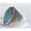 Navajo Sterling Turquoise Bracelet by Running Bear, inside measures 6.5'' which includes opening x 2''W, bold and large sterling silver bracelet set with a stunning turquoise cabochon (measuring 1'' x 1.5''L), beautiful hand stamping on band, carved silver border around cabochon, hallmarked RB inside of bear and stamped .925, 64.9g in total wt. Truly a work of art!