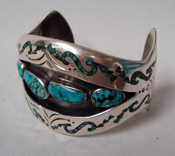 Native American Navajo Sterling Turquoise Bracelet, this unique bracelet has 4 gorgeous Nevada Turquoise cabs housed in shadowbox style layout, above and below these stones are beautiful chip inlay scrollwork accents, hand stamping completes the piece, inside measurement of 6 7/8'' x 1 7/8''W.