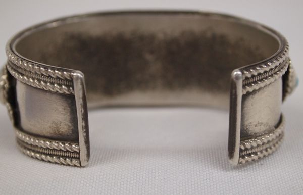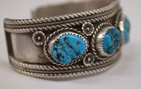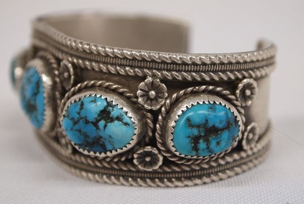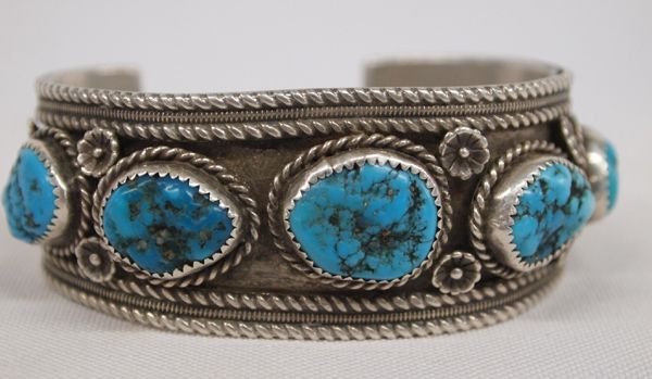 Navajo Sterling Turquoise Bracelet, features 5 gorgeous turquoise nuggets with black matrix set in a traditional setting of small silver flowers and twisted silver rope accents, inside measures 6.5'' including opening x 1''W, Dynamic