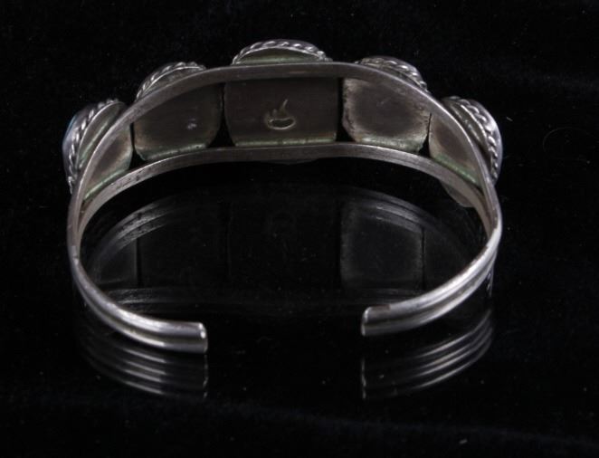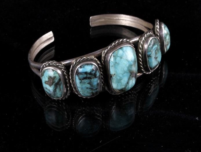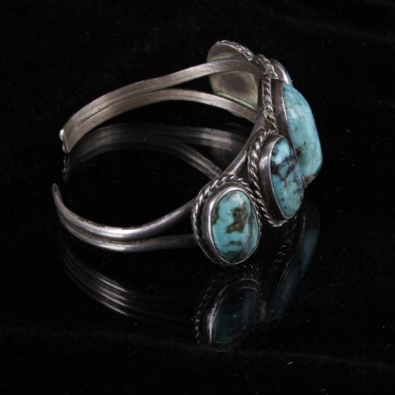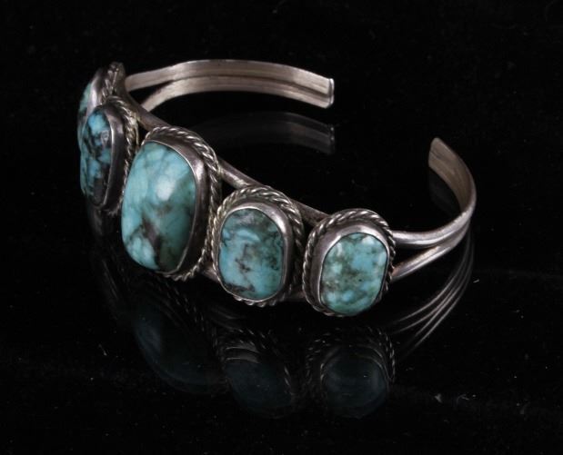 This lot features a stunning Navajo sterling and turquoise bracelet. The turquoise stones appear to be Ajax Turquoise with a stunning blue green black shine. The piece is made of sterling silver unmarked. However, the bracelet has a markers mark on the back. The overall condition of the piece is good . Measures: 5" Diameter x 1" D