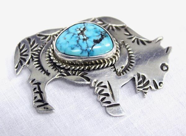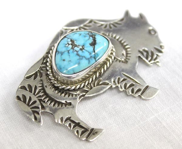 Navajo Sterling Turquoise Buffalo Pin Pendant by noted artists Albert & Janette Cleveland.  pin pendant measures approx. 1 1/4'' x 1 7/8''.  Buffalo is Hallmarked AJC.