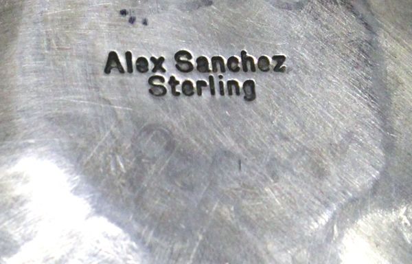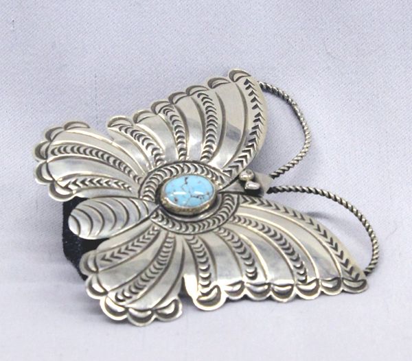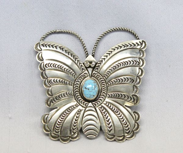 Native American Navajo Sterling & Persian Turquoise Butterfly Pin by Alex Sanchez. Bold and handsome butterfly pin with silver stamping designs worked to perfection. The oval turquoise cabochon is set in the middle, providing a focal point, blending with the over-all design. The pin measures 3 1/8'' x 2 7/8'', the stone is 1/2'' x 3/8''. It is signed ''Alex Sanchez'' ''Sterling''.