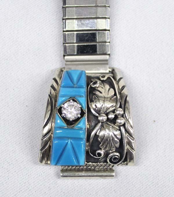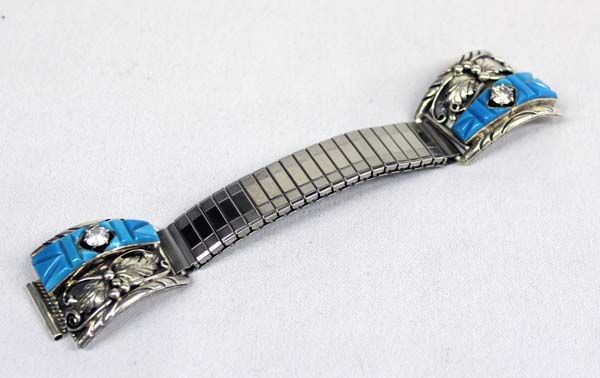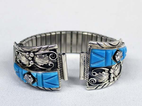 Navajo Sterling Turquoise CZ Watch Band hallmarked P, measures 6''L from pin to pin, beautiful traditional setting of scrollwork, leaves, and silver bead accents, features two carved turquoise pieces each set with a large CZ, stamped sterling, 41.12g in total wt.