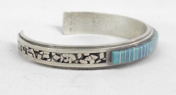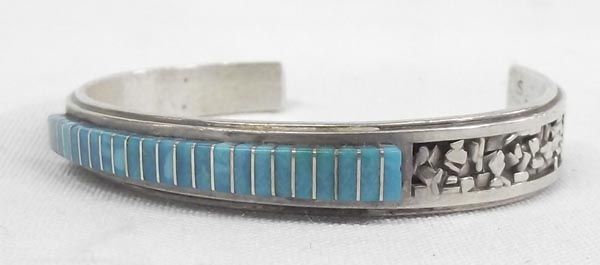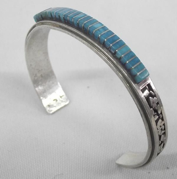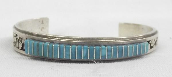 Navajo Sterling Turquoise Channel Inlay Bracelet. Dazzling and distinctive would describe this unusual turquoise channel set bracelet, features 24 stones accented with unusual incised silver designs on each side, nice geometric motif. Stamped ''Sterling'' inside, measures approximately 6'' by 1/4'' wide.