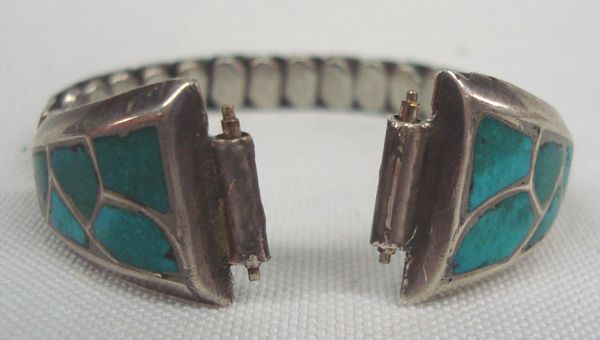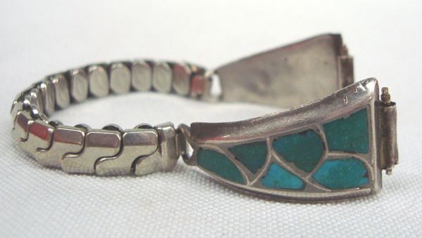 Navajo Sterling Turquoise Channel Inlay Watch Tips, dark blue green channel inlay turquoise cabs, tips measure 5/8'' x .25''