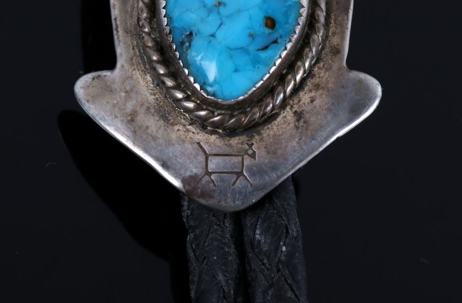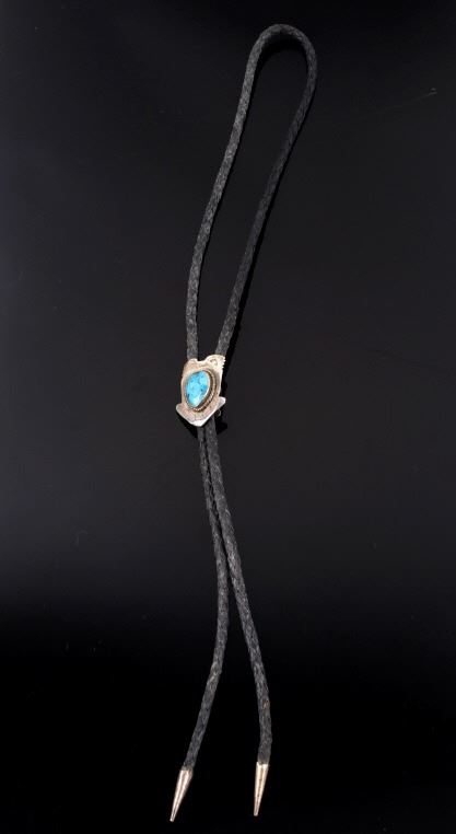 For your consideration in this lot we have a Navajo Native American sterling silver and turquoise chip inlay bolo tie. The tie shows a sterling silver slide with a turquoise chip inlay cabochon at the center and a woven leather tie with silver caps. The slide shows a roughly arrow shape with tooled designs in three of the corners. The center of the slide displays a sleeping beauty turquoise chip inlay cabochon with a silver rope border. The piece shows a standard folding clasp in the back and is free of makers marks or signatures. The piece shows good condition overall with some light wear and warm patina on the silver. The tie measures 19" long with the slide measuring 1 1/2" long by 1 1/4" wide.