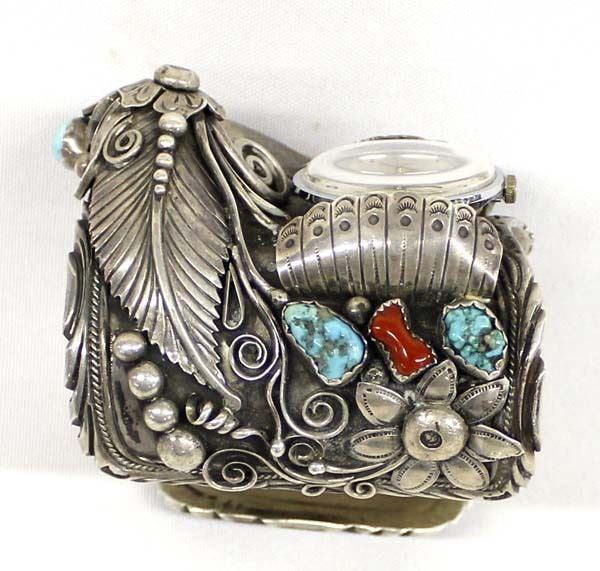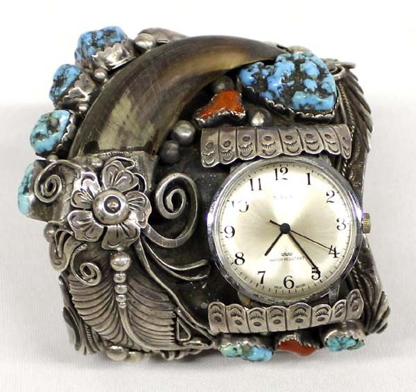 Phenomenal Vintage Native American Navajo Sterling Turquoise, Coral, and Claw Watch Bracelet by Joe Apachito (d. 2012), inside measures 8'' which includes the opening x 3''W, engraved signature and sterling, well over 100g in total wt., largest turquoise stone measures 1.25'' x 7/8'', claw measures roughly 3''L, tremendous amount of silverwork in this piece and the turquoise and coral is incredible
