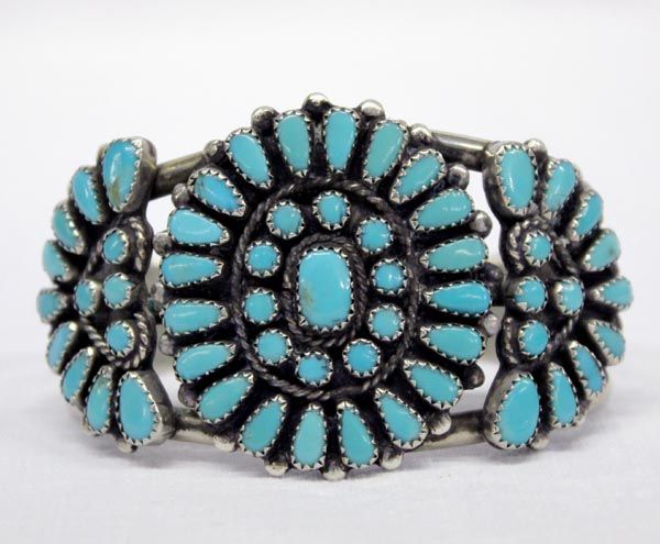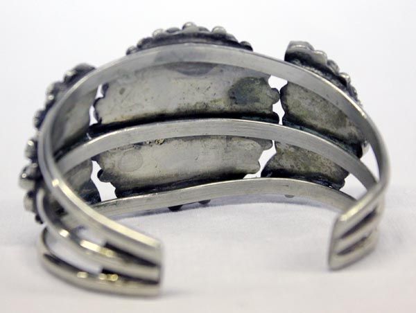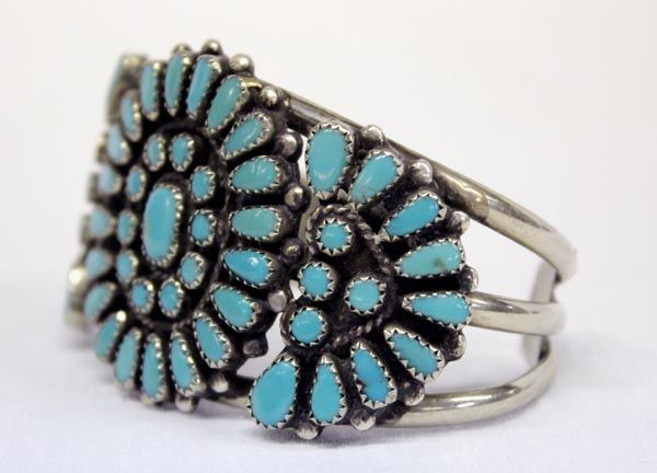 Navajo Sterling Turquoise Cluster Bracelet, inside measurment including space measures approx. 6.5''. Large Cluster measures approx. 2 5/8'' x 2 1/2''W.