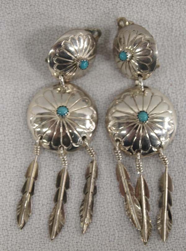 Navajo Sterling Turquoise Concho Clip-On Earrings, measure 2.25''L x .75''W, 8.9g in total wt