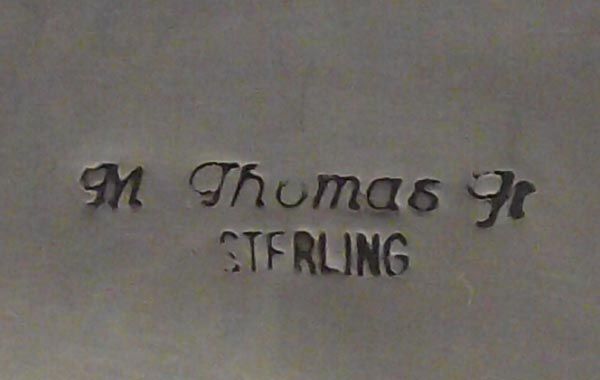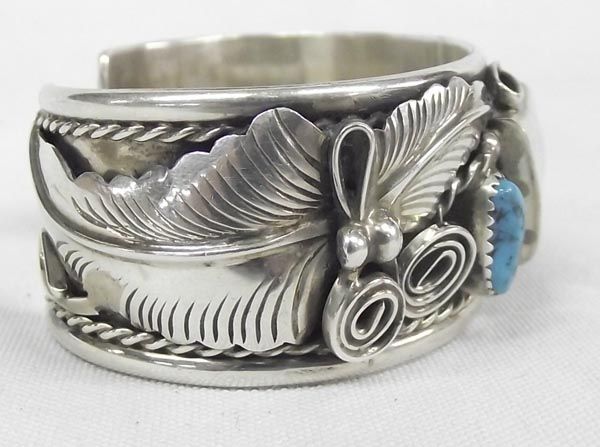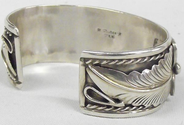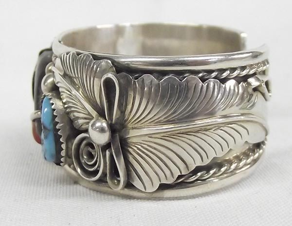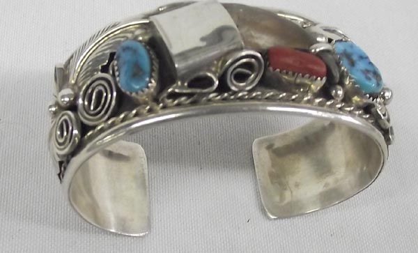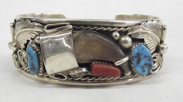 Navajo Sterling Turquoise Coral Claw Bracelet. To this substantial, heavy (64.8 grams) sterling silver bracelet, the artist has added two turquoise cabochons, a coral cabochon and a claw and surrounded them with overlay feather and swirl. A real showpiece. Stamped on the inside, ''M Thomas Jr. Sterling''. Measures 7-3/8'' inside including opening and 1-1/8''W.