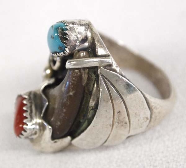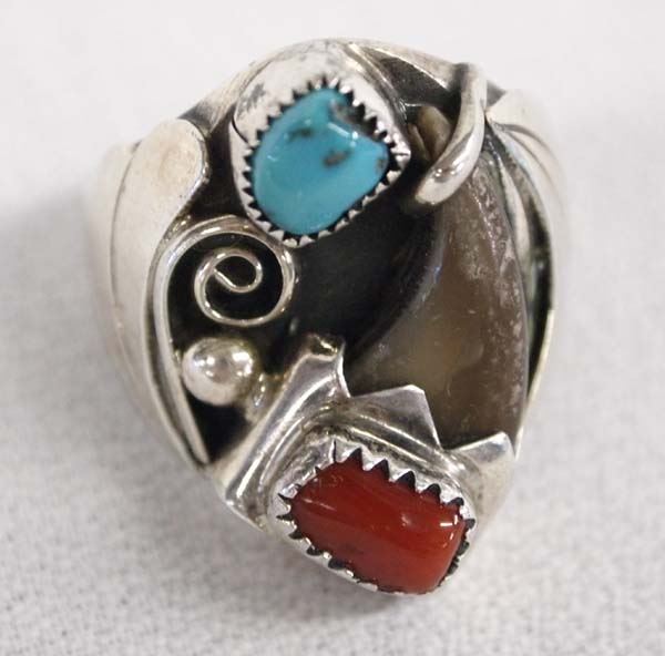 Native American Navajo Sterling Silver Turquoise Coral and Claw Ring by Albert Mac Cabe, Size 10, hallmarked AC and stamped sterling, 20.51g in total wt.