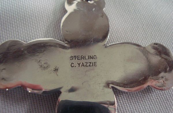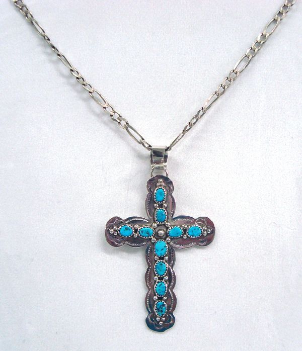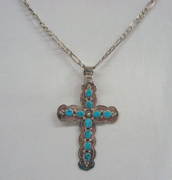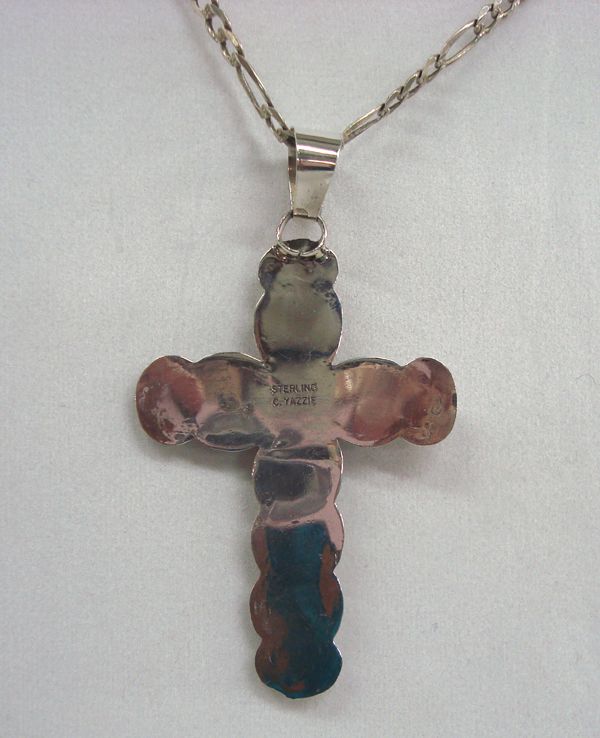 Navajo Sterling Turquoise Cross Pendant - C Yazzie. Stabilized turquoise nuggets in their natural shape overlayed on a flat sterling silver cross with stamped design. The back is stamped ''Sterling C Yazzie''. The chain is handmade and measures 24'' end to end. The cross is 3'' x 2''.