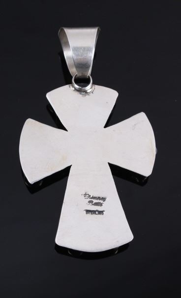 For your bidding pleasure is this Signed Navajo Sterling Turquoise & 3 Cross Pendant. This Three cross decorated cross pendant is made of solid sterling silver adorned with three well polished Sleeping Beauty turquoise stones. The Pendant shows a fancy arrangement of bubbled silver with three silver crosses. This pendant is stamped Sterling and is marked "Chimney Butte." The measurements of this cuff are 3 1/4" x 2 1/8".