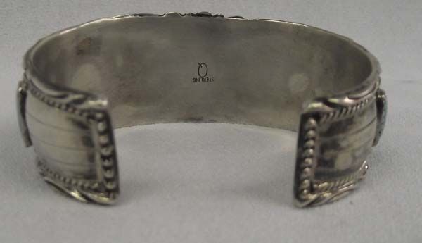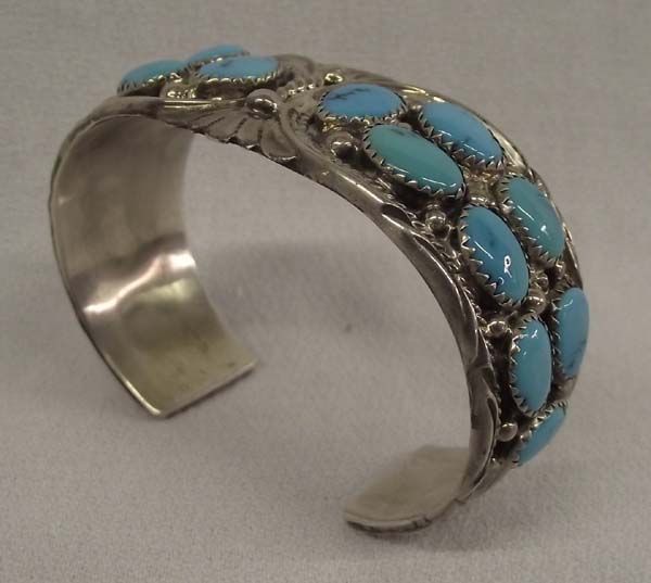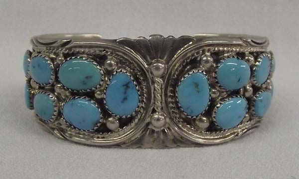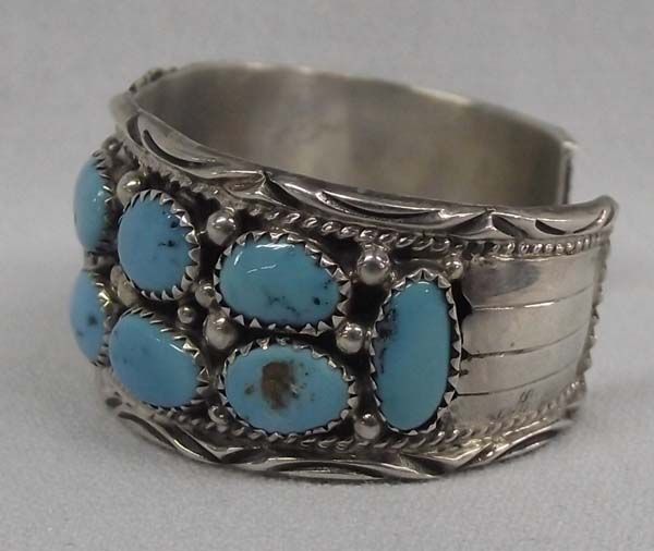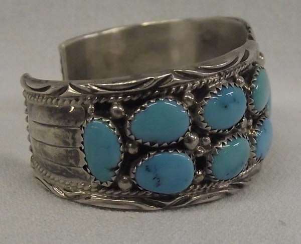 Native American Navajo Sterling Turquoise Cuff Bracelet, 16 gorgeous blue turquoise polished cabochons, black and brown matrix, ornate silverwork (twisted rope, bead, fan, hand stamping), hallmarked Q and Sterling, measures 6 3/8'' inside by 1''W