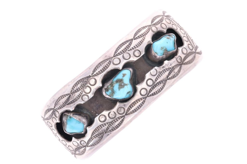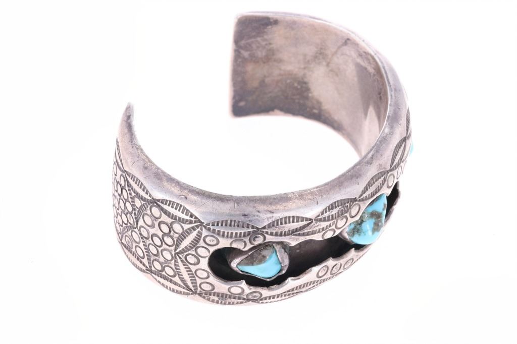 Featured in this lot is this Navajo, sterling & Sleeping Beauty cuff bracelet. This piece is unmarked, showing no makers signature or hallmark. This sterling cuff bracelet shows an older style and features three nuggets of Sleeping Beauty turquoise set in a shadow box setting. It is stamped with Southwestern, geometric designs throughout. It shows good condition overall with a slight patina present from its age and use over the years. No signs of damage is noted. It measures 1 1/8" L x 2 3/4" W x 2 1/8" H and weighs 49.7 grams.