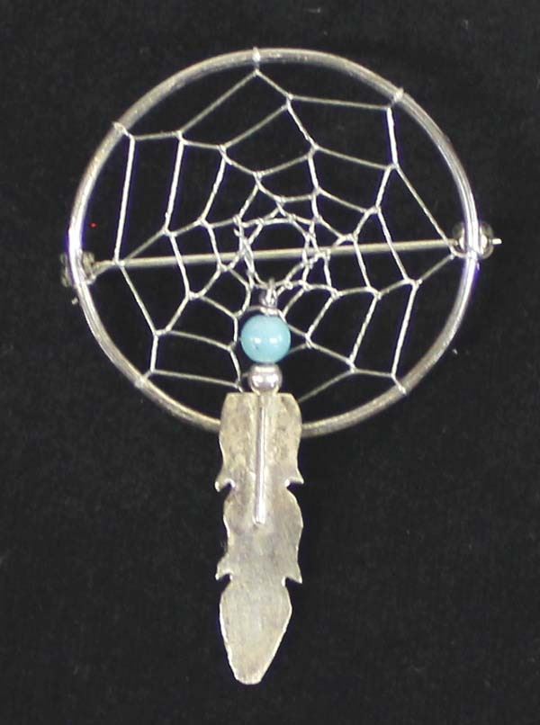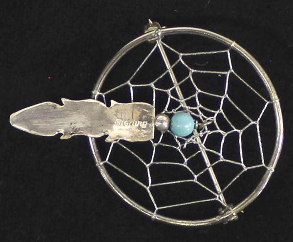 Native American Navajo Sterling Turquoise Dreamcatcher Pin, measures 1.25'' x 2.25'' and is stamped sterling