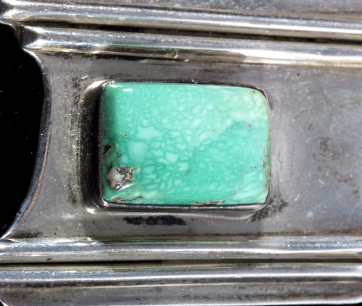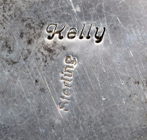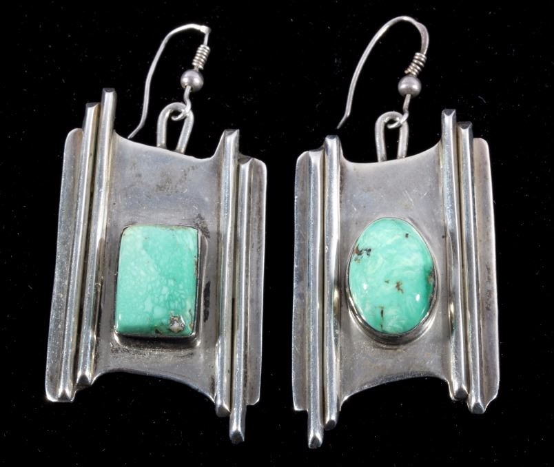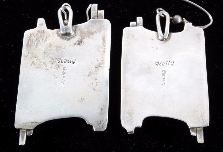 This is a set of sterling silver and turquoise earrings signed by the Navajo Native American Indian silversmith, Kelly. Each piece is hallmarked Kelly and Sterling and are in good condition. Each measures 1 1/8"W x 2.5"L.