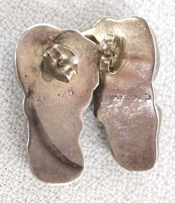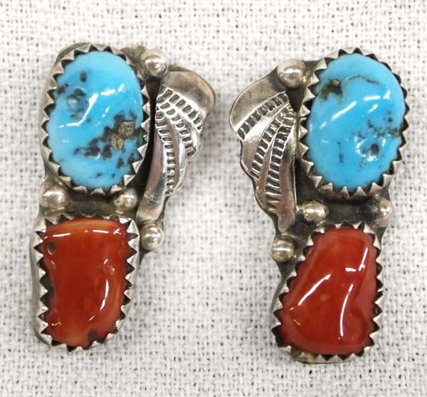 Native American Navajo Sterling Turquoise Earrings by Kathy Francisco, nice pair of vintage sterling silver earrings set with turquoise and red coral, hallmarked and measure 1'', great pair of traditional Navajo earrings, 4.8g in total wt.