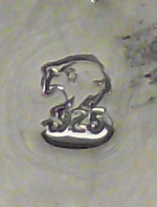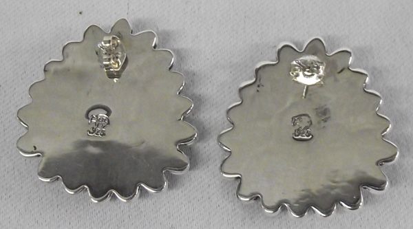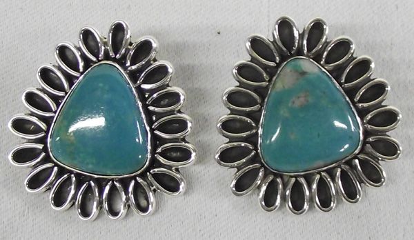Navajo Sterling Turquoise Earrings. Triangle turquoise cabochons are surrounded with looped silver in these settings. On the back, there is a hallmark of a bear with initials inside, which we believe are RG or RB. They measure 1''x1-7/8''.