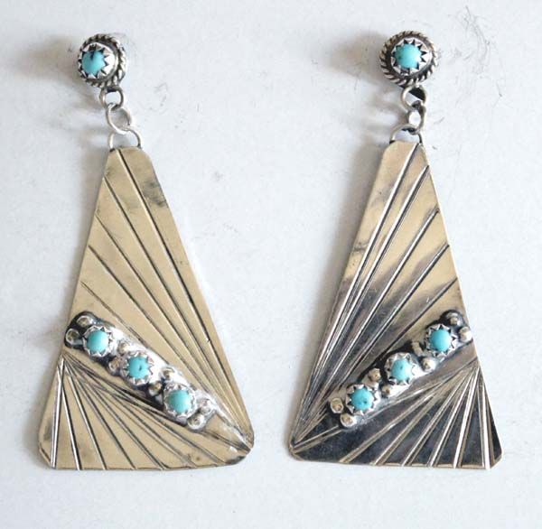 Navajo Sterling Turquoise Earrings, measures 2''L x 1''W, beautiful long sterling silver post earrings set with 8 sky blue turquoise cabochons (1/16''D), stamped sterling, carved silver diagonal accents, 6.99g in total wt.