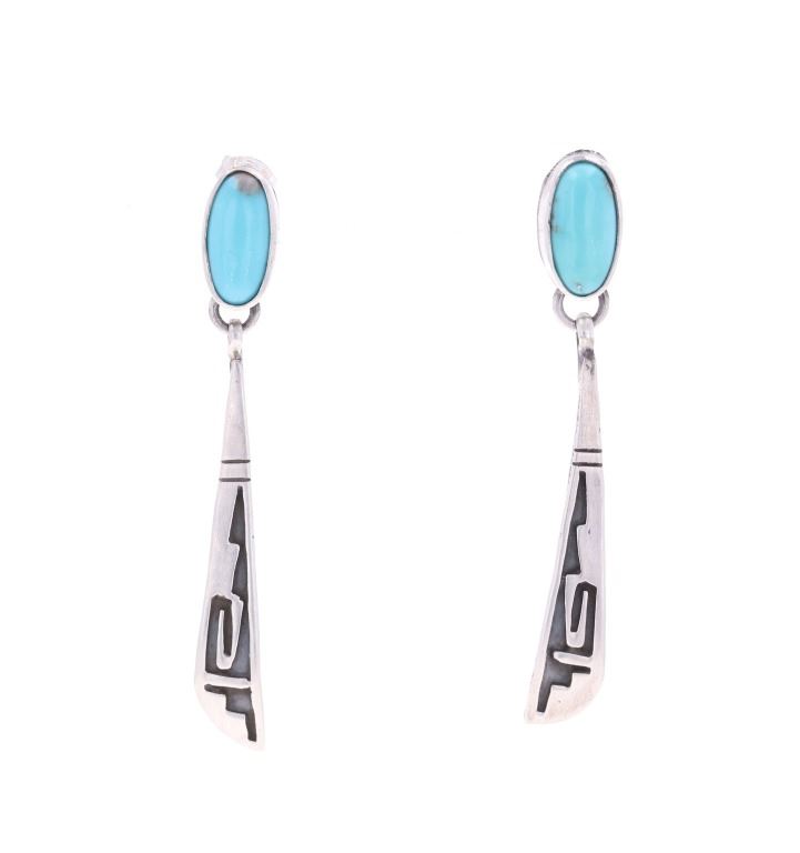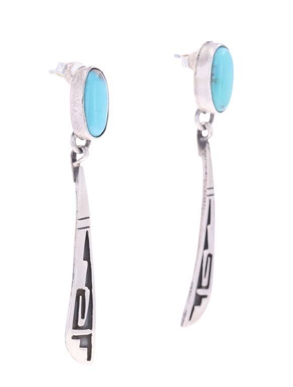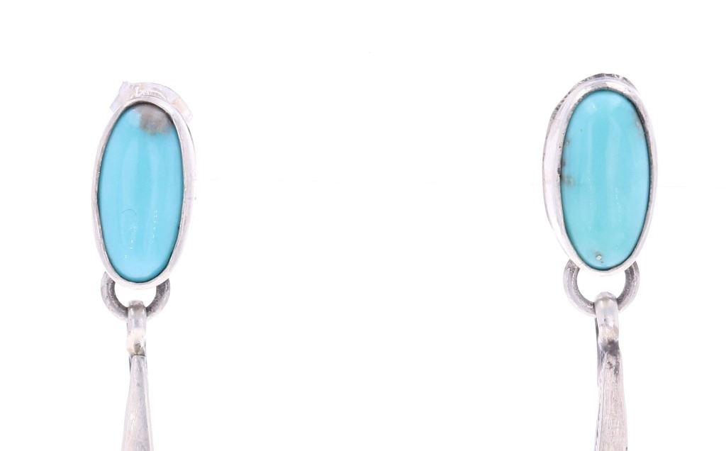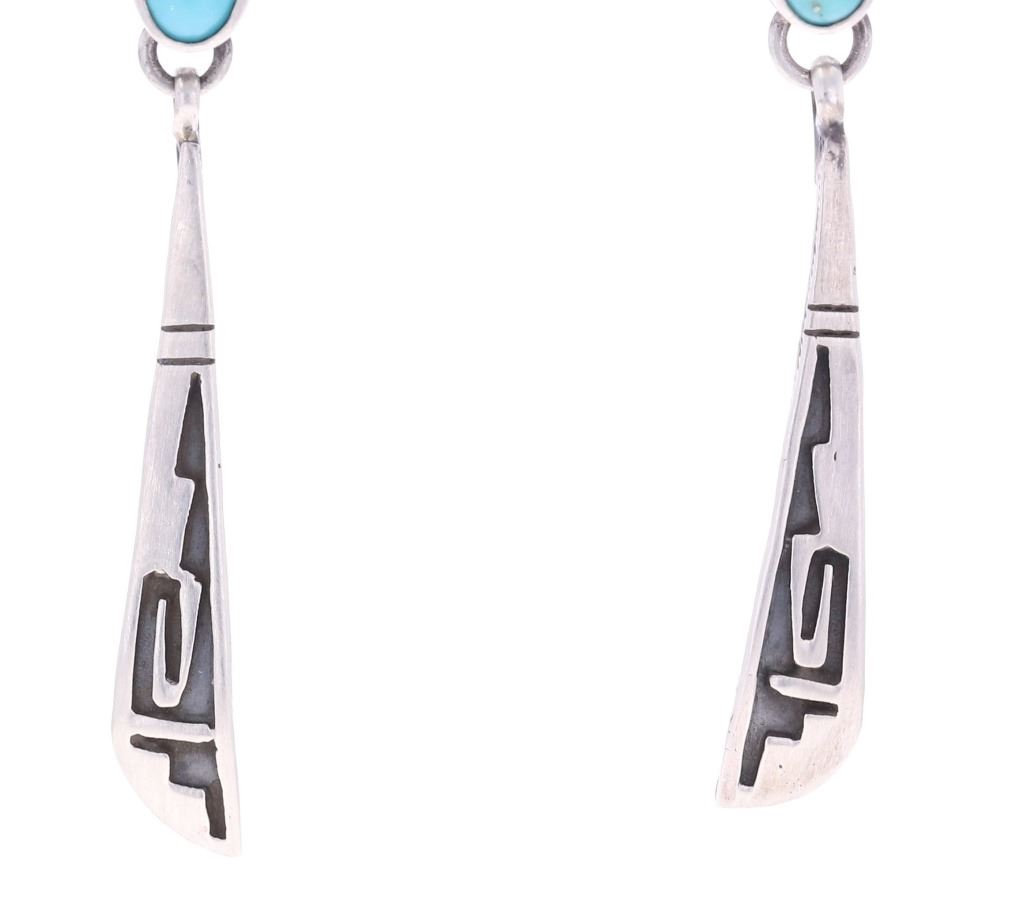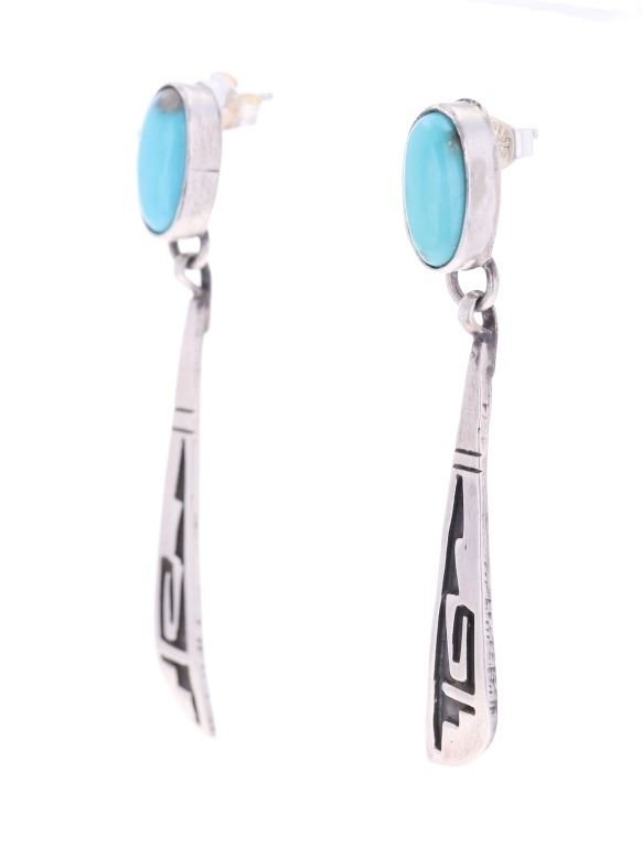 Featured in this lot is this pair of Navajo sterling and Sleeping Beauty dangle earrings. The earrings face show a simple yet elegant tooled geometric design, and feature an oval cut cabochon of Sleeping Beauty turquoise set at the top. The back of one of the earrings is marked "sterling" while the earring backs are marked, "Sterling .925". The earrings show good condition overall with no wear or damage present. They measure 2 1/16" L x 1/4" W, with the Sleeping Beauty turquoise cabochons measuring 1/2" L x 1/4" W. They have a collective weight of 6.8 grams.