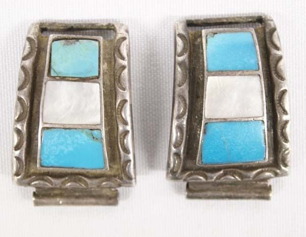 Native American Navajo Sterling Turquoise Mother of Pearl Inlay Watch Tips, measures 1''W x 1.5''L, 37g in total wt.