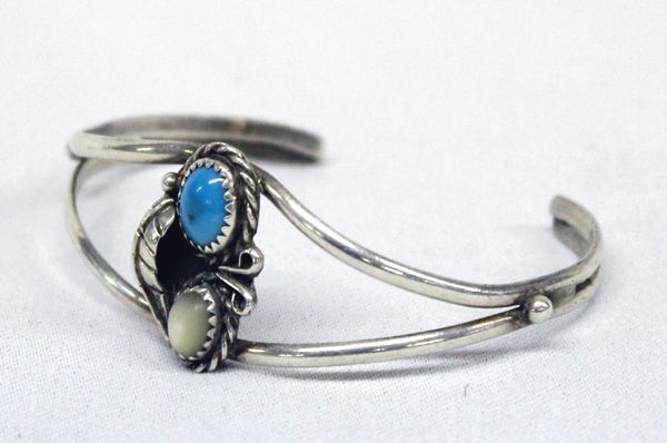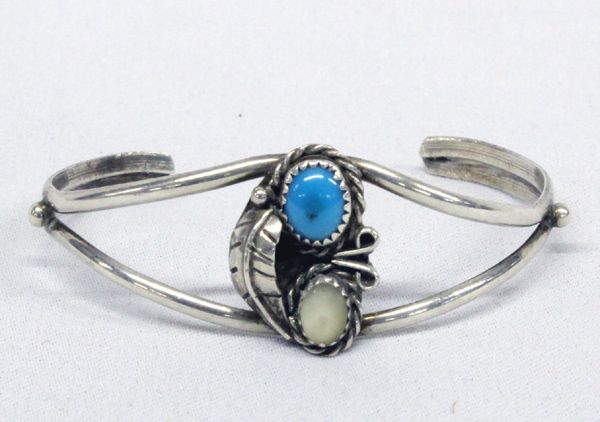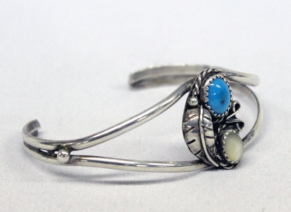 Native American Navajo Sterling Turquoise Mother of Pearl Bracelet, lovely silver feather design, scrollwork, not stamped sterling but tested as same, unsigned, interior circumference is 5'' plus 1.5'' gap which allows for a little flexibility for adjustment.