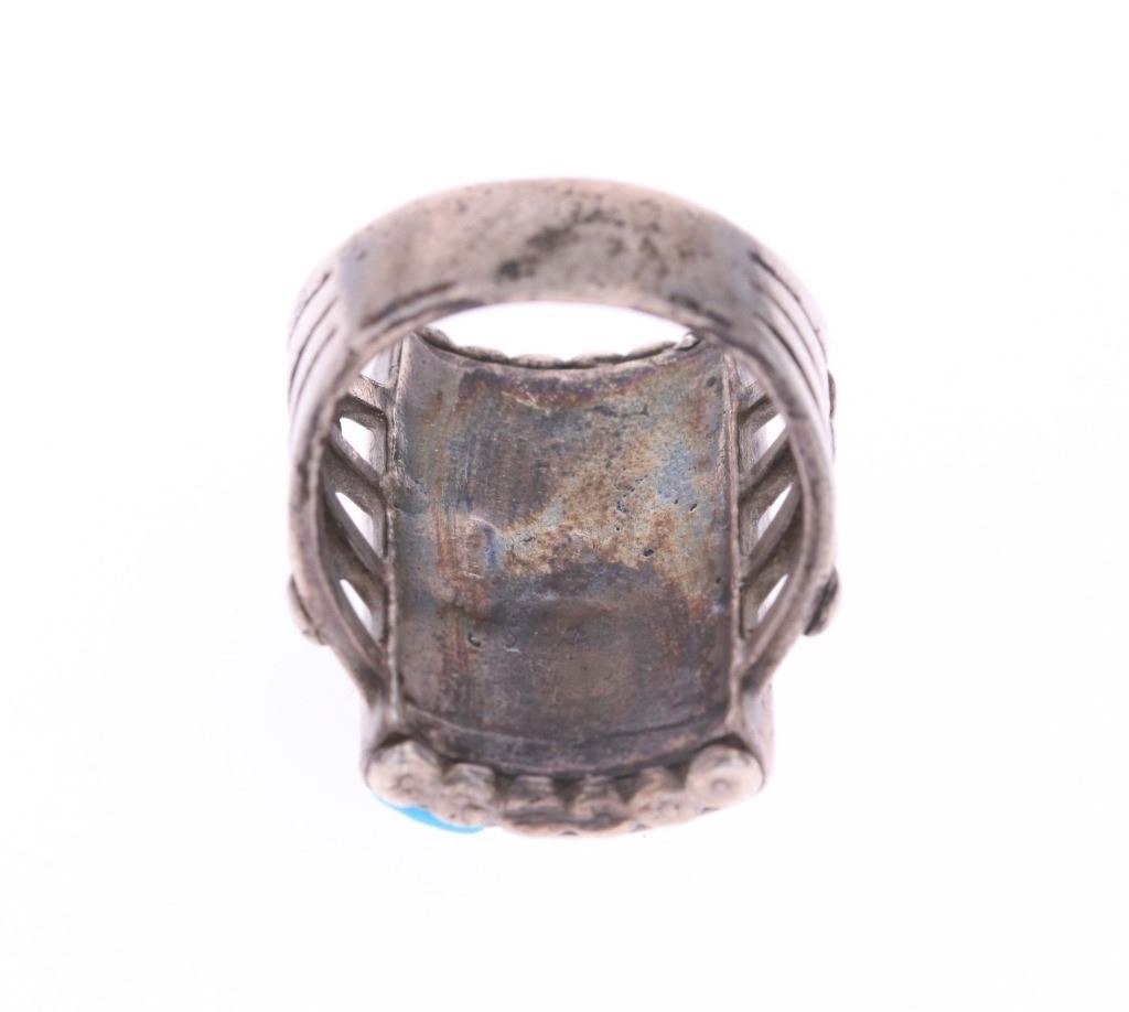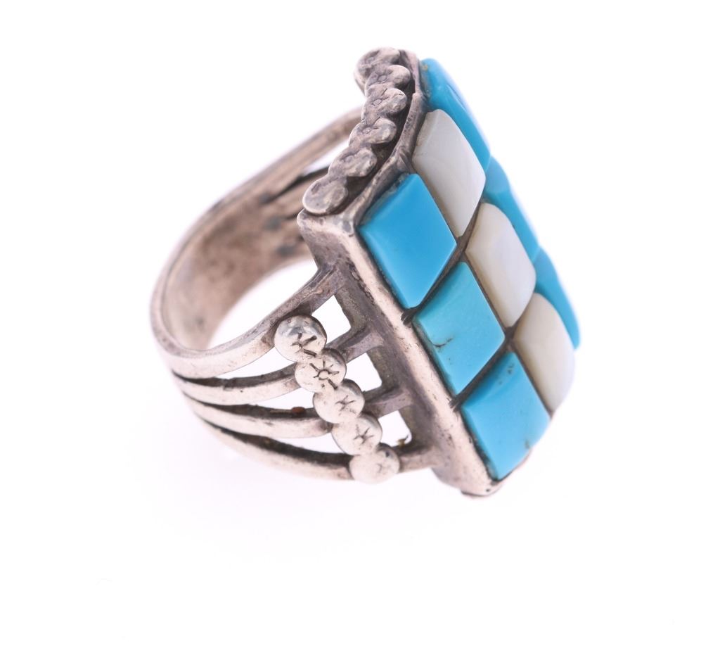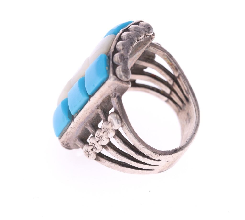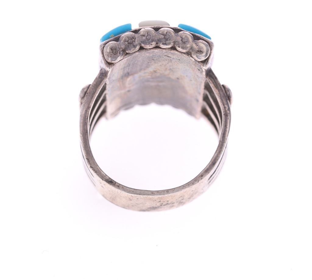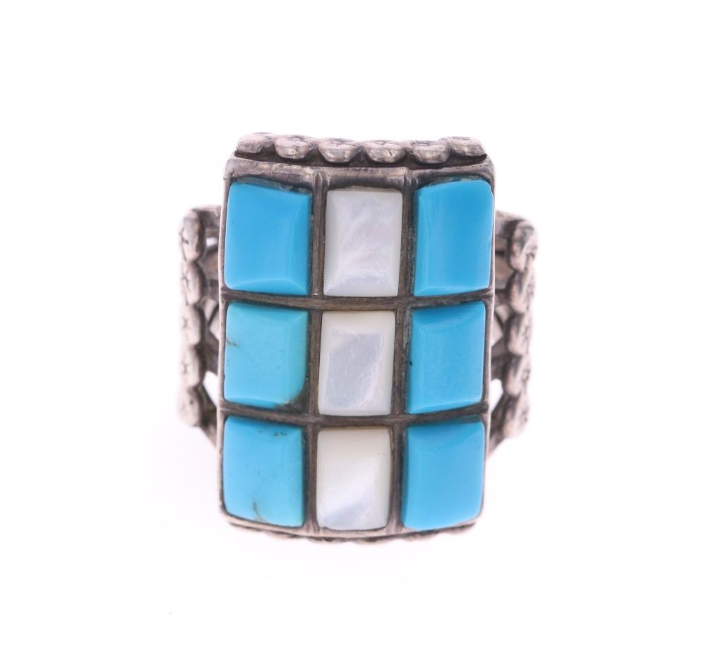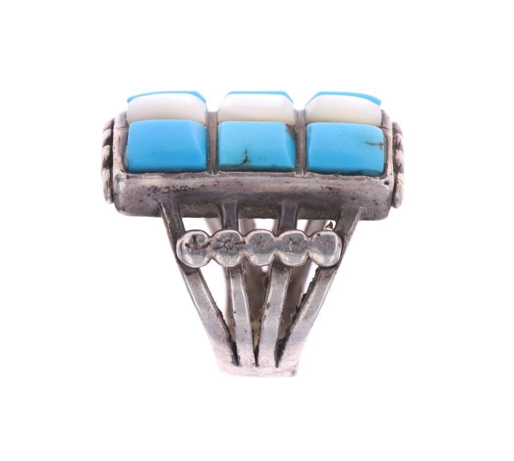 Featured in this lot is this Navajo Native American sterling, turquoise and mother of pearl ring from the 20th century. The ring shows a sterling construction with inlaid pieces of Sleeping Beauty turquoise on the left and the right and inlaid pieces of mother of pearl set in the center. Six pieces of turquoise are present and three pieces of mother of pearl are present. The ring shows no makers marks or hallmarks. It shows good condition overall with a slight patina present from its age and use over the years. No signs of damage noted. It measures 1 1/8" L x 1" W x 1 1/8" H, is a size US 10 1/2 and weighs 19.9 grams.