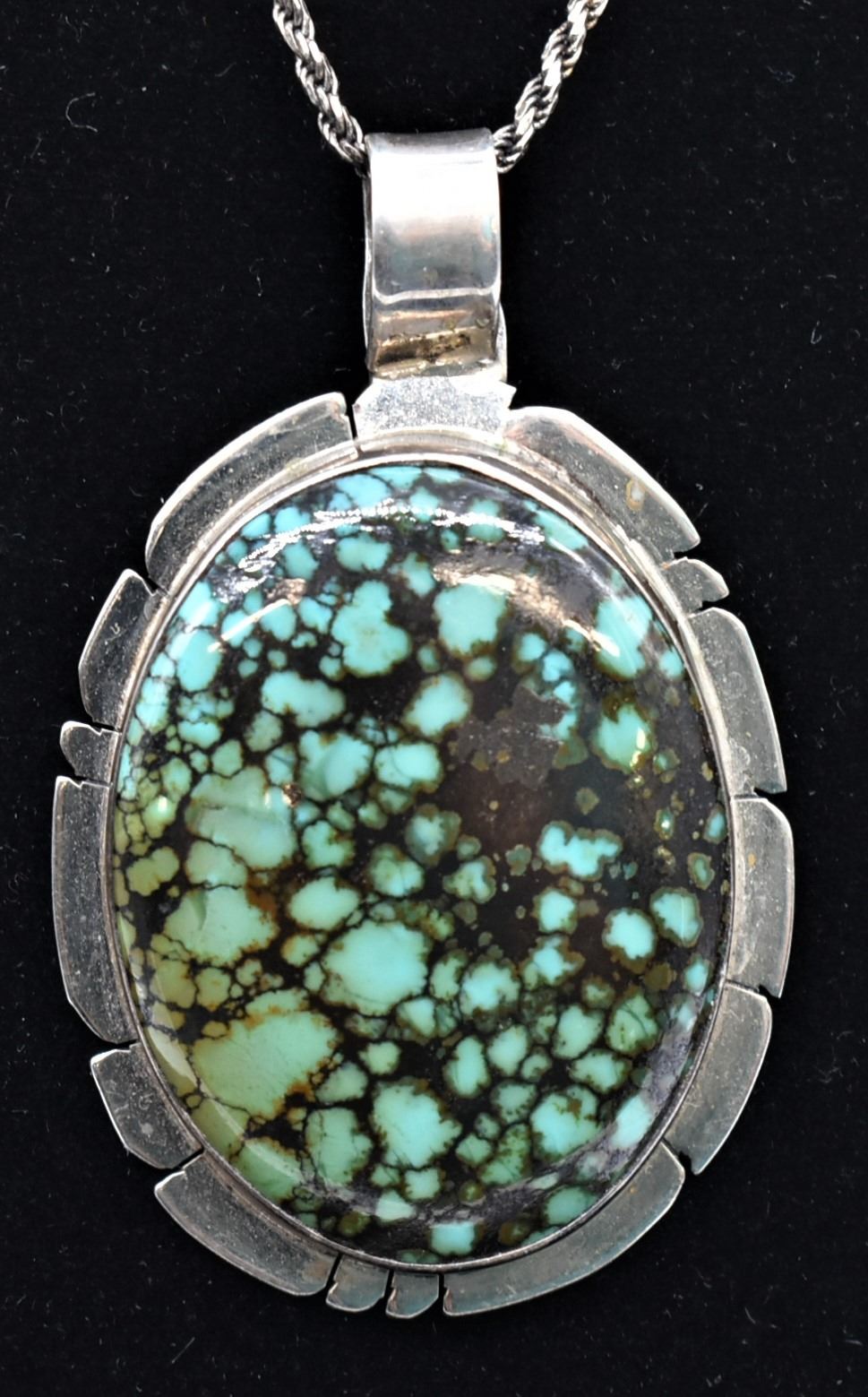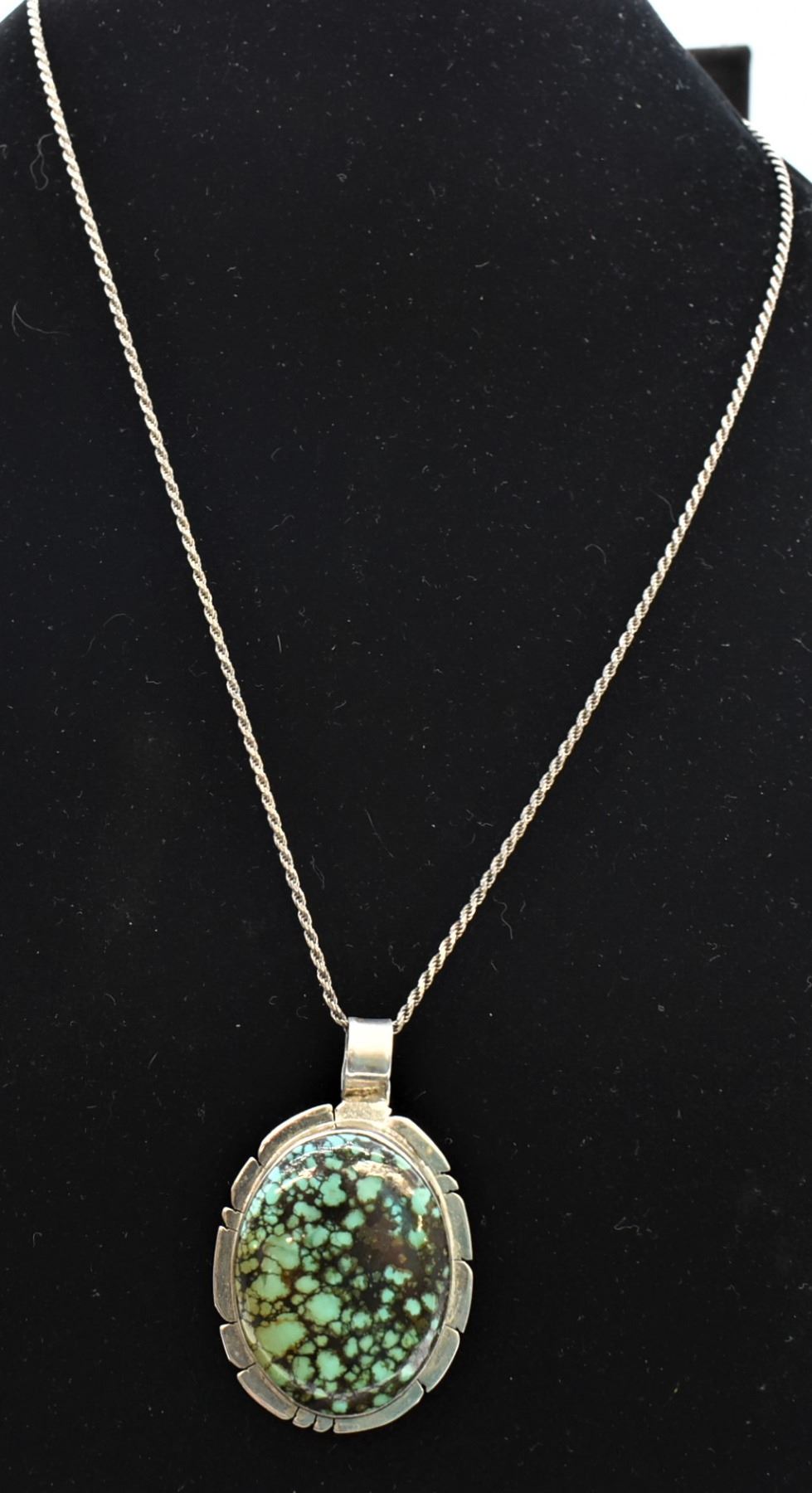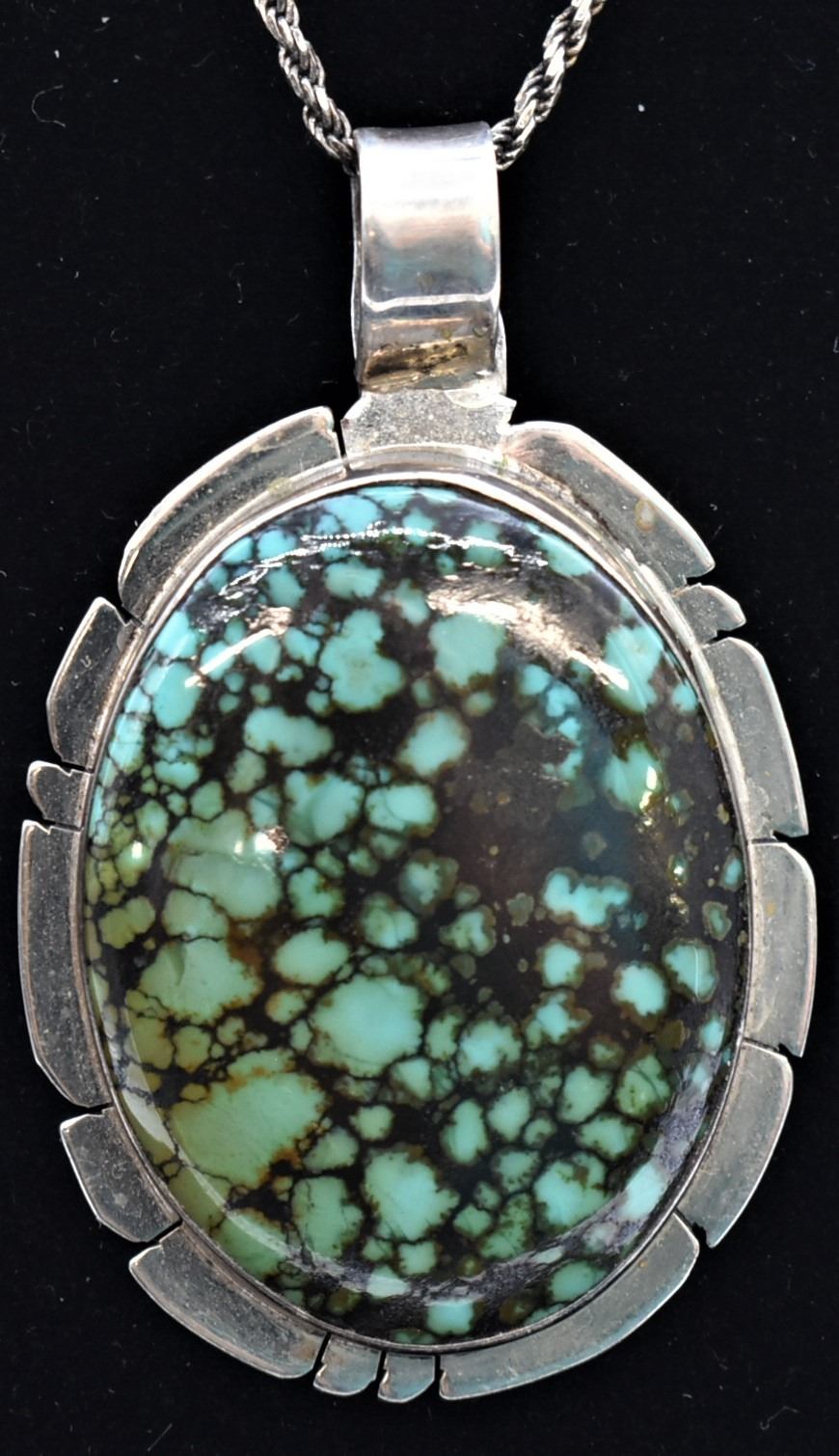 Navajo Sterling Turquoise Necklace by Artist Alonzo Mariano. Necklace has a very unusual spotted effect & is very large, measures 2 & 3/4", end to end chain 24"
