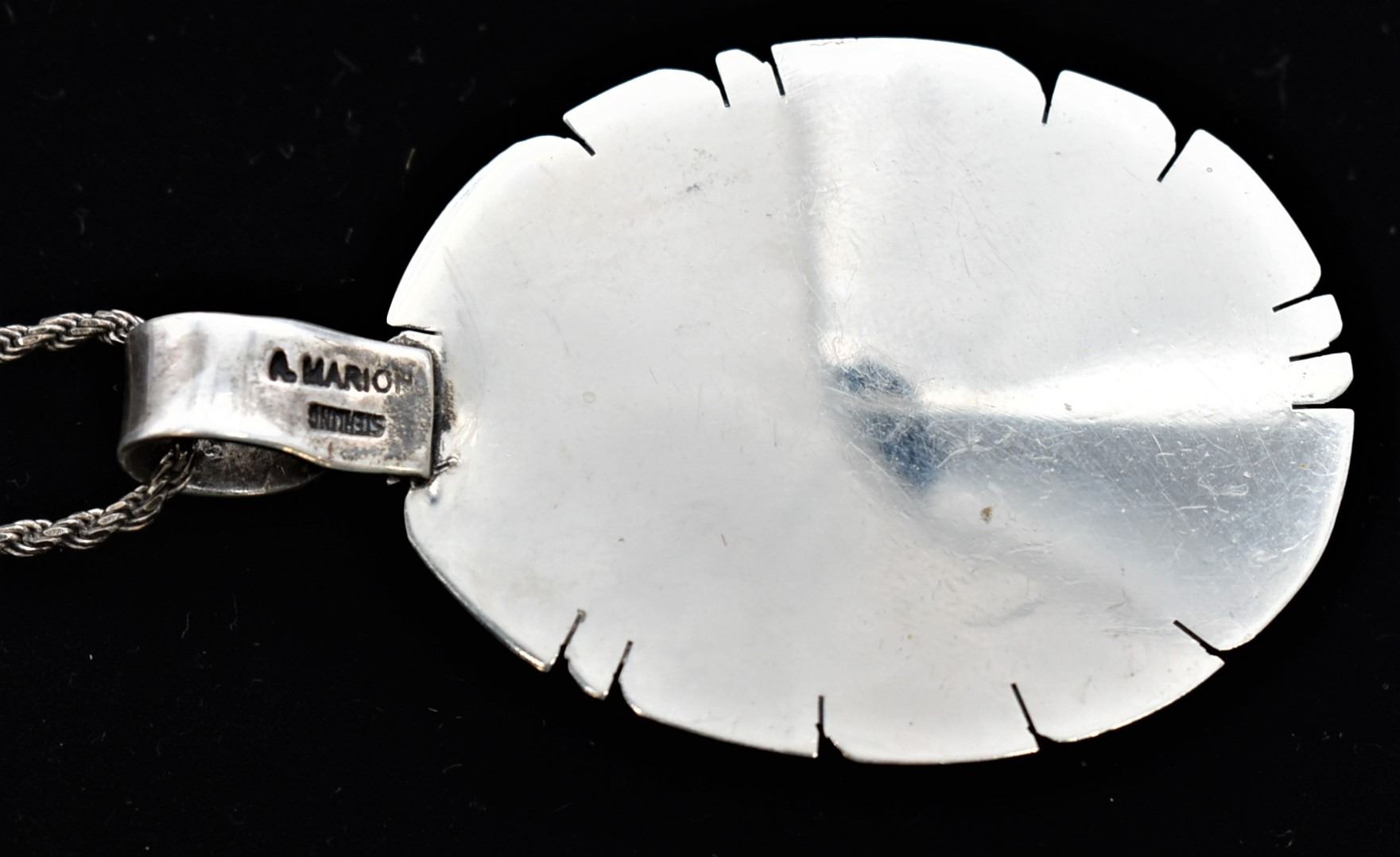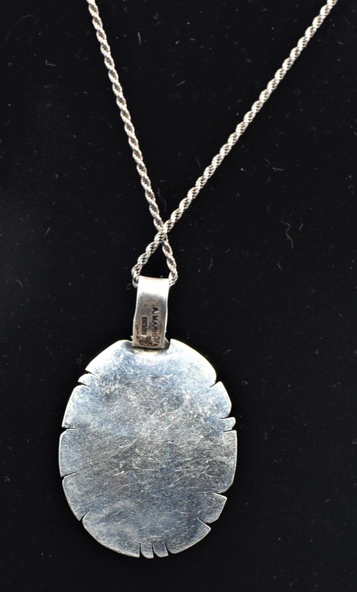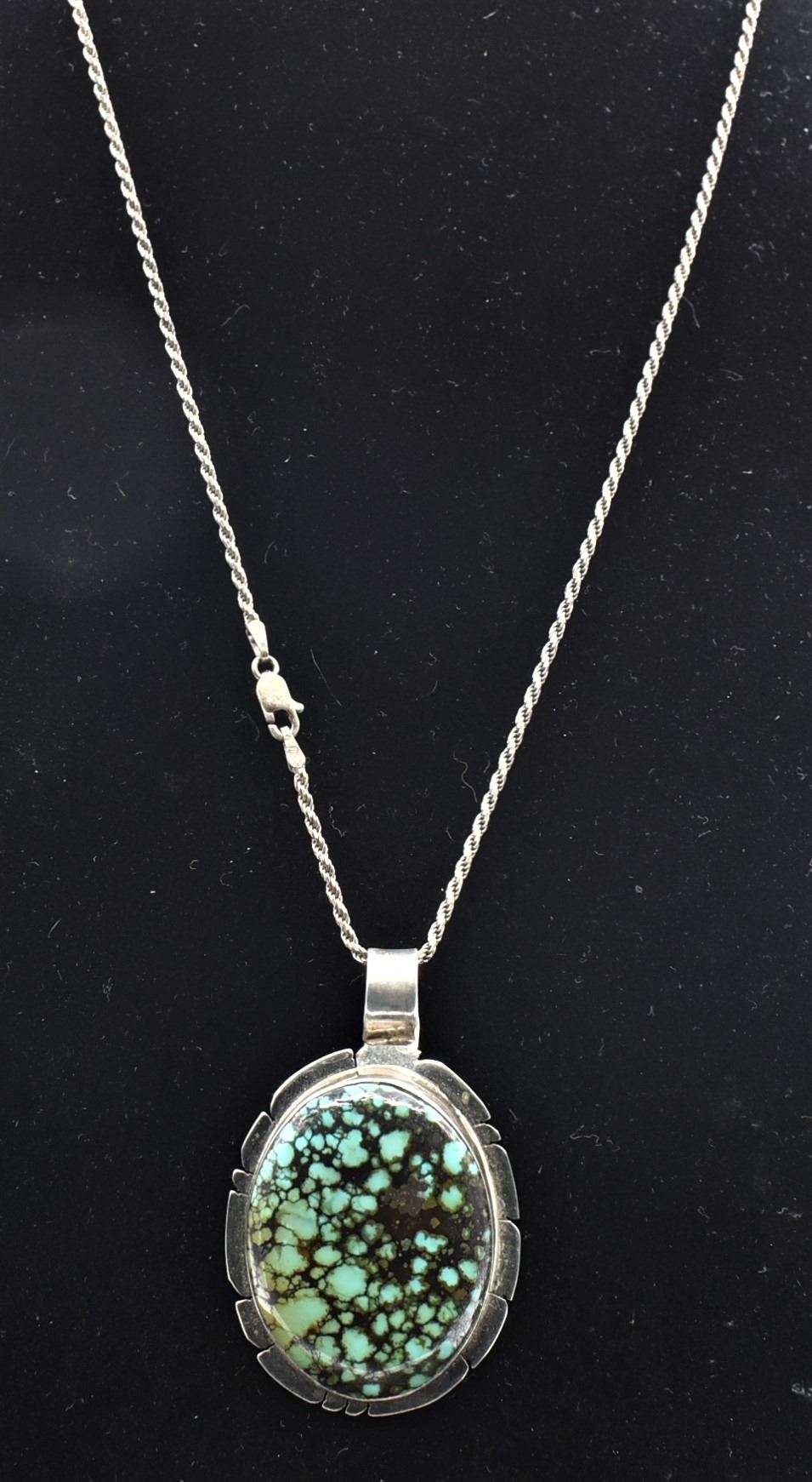 Navajo Sterling Turquoise Necklace by Artist Alonzo Mariano. Necklace has a very unusual spotted effect & is very large, measures 2 & 3/4", end to end chain 24"