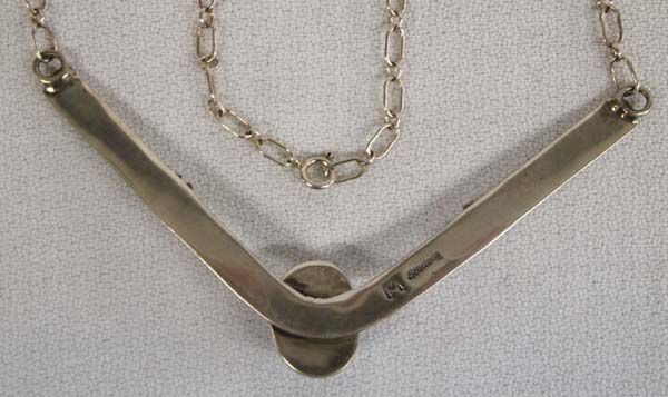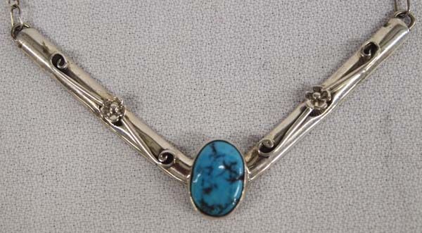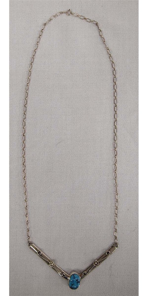Navajo Sterling Turquoise Necklace by Margie Chee, measures 22'' end to end x 3'' x 1.5'', stamped sterling and hallmarked M, hand wrought chain, 17.9g in total wt.