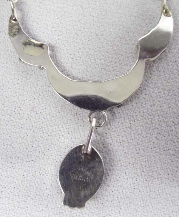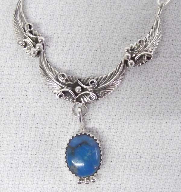 Native American Navajo Sterling Turquoise Necklace, gorgeous dark blue turquoise cabochon with brown matrix, fabulous silver leaf, bead, and scrollwork accents, handmade chain. Exquisite piece!