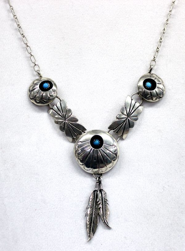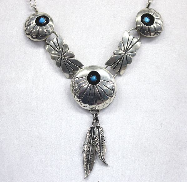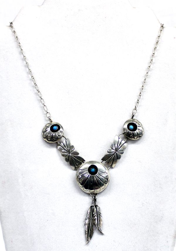 Navajo Sterling Turquoise Necklace, measures 18'' end to end, pendant measures 5'' across x 2.75''L, features shadowbox style design with 3 turquoise cabochons measuring 1/8''D and sterling feather dangles, 24g in total wt.