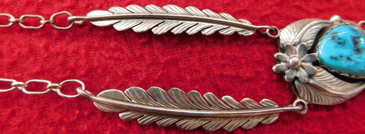 Navajo Sterling & Turquoise Necklace, circa 1980s. Made of sterling silver and turquoise, the pendant measures 2" x 0.75" with drops and the chain is 17" long. Navajo, signed JL. Nice silver leaf design throughout, with 3 used as drops, 2 on pendant, and 2 where chains meets pendant. Lot weight is approx. 13.8 grams. Condition: Very good, see images. Shipping: $16.50 w/insurance and signature.