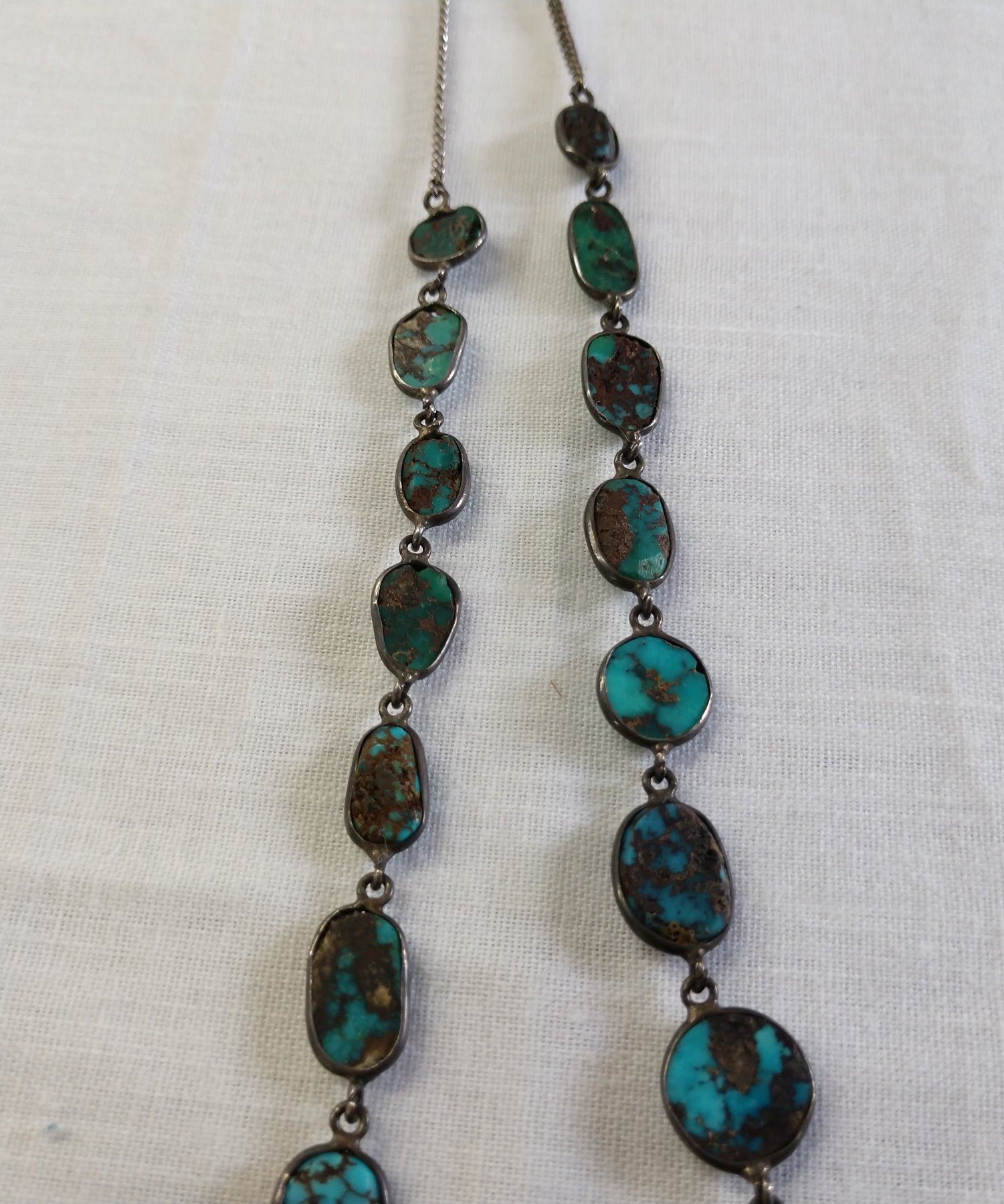 Navajo Sterling & Turquoise Necklace, c. 1930s. Made of sterling silver and turquoise, the item hangs 9 1/2" as worn. Navajo. Bisbee turquoise, very rare. Condition: Good, nice patina, see images. Shipping: $18.50 w/insurance and signature.