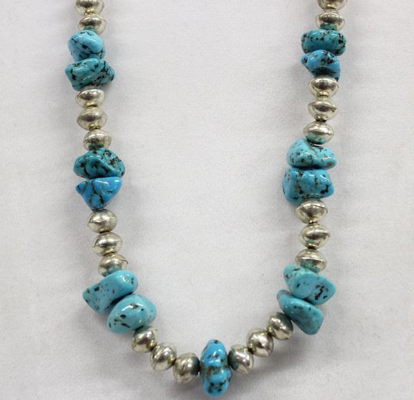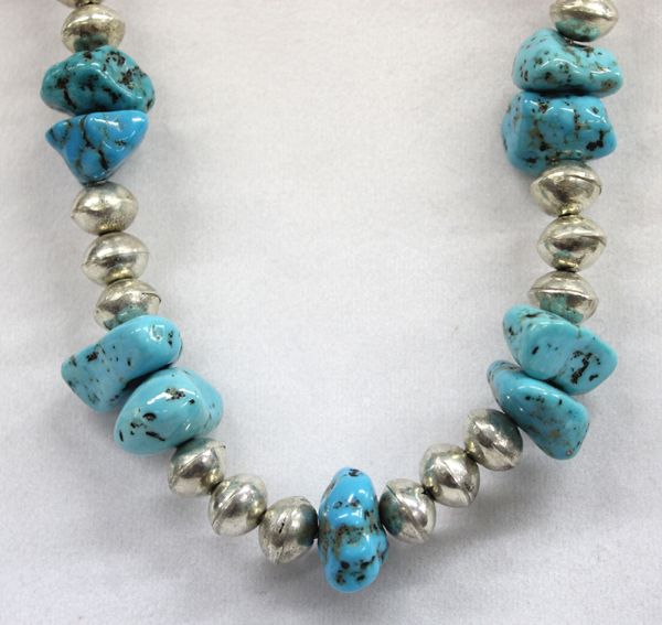 Striking Navajo Sterling Hollow Bead and Turquoise Nugget Necklace, measures 18'' end to end, largest nugget measures 1''L, sterling silver hollow beads measure 3/8''D