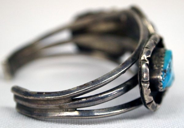 Navajo Sterling Turquoise Pawn Bracelet by Bennie Dickson, inside measurement of 6.25'' which includes gap x 1.25''W, traditional style with scalloped edging, notched silverwork, and silver bead accents, triple band