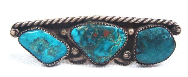 Navajo Sterling Turquoise Pawn Ring, traditional design of silver twisted rope and silver peyote bead accents, features 3 gorgeous blue cabochons (7/8'' x .75'') with coppery brown matrix, scalloped edging on one side, fingerlength ring which measures 3.75'' x 1'', size 8, very unique, double band shank which tapers down into one band