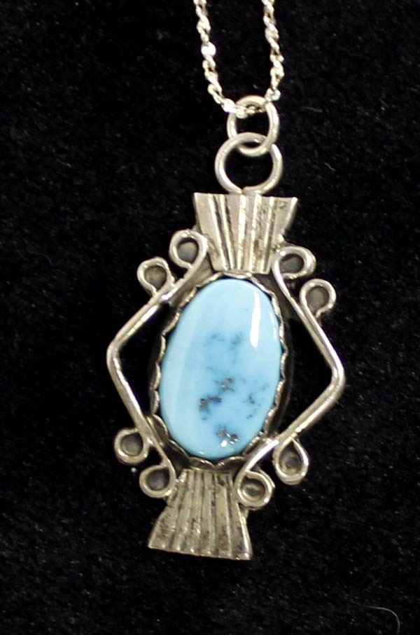 Native American Navajo Sterling Turquoise Pendant Necklace, Italian sterling chain measures 18''L end to end and pendant measures 1.25''L, turquoise cab measures 5/8''L x .5''W, stamped sterling and hallmarked N