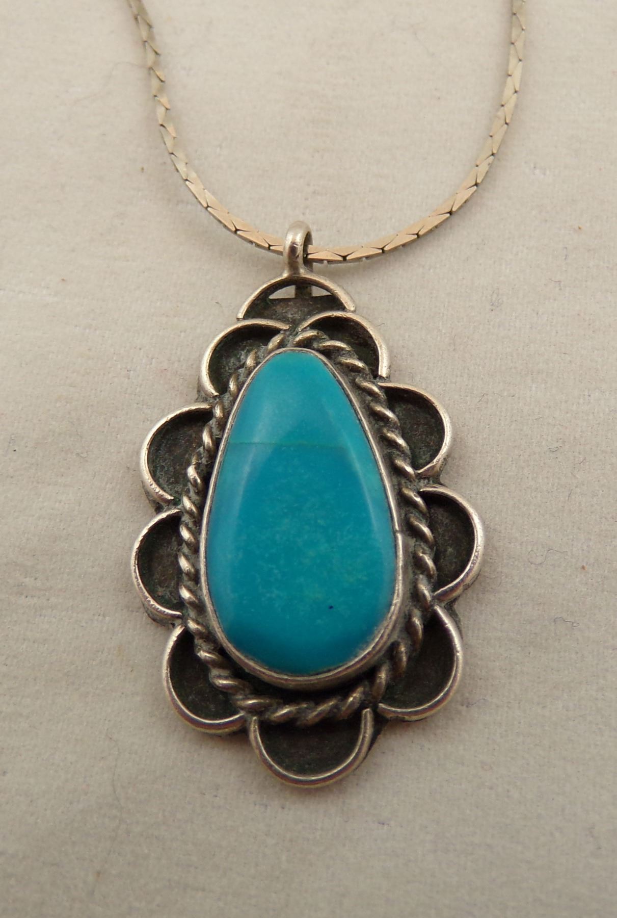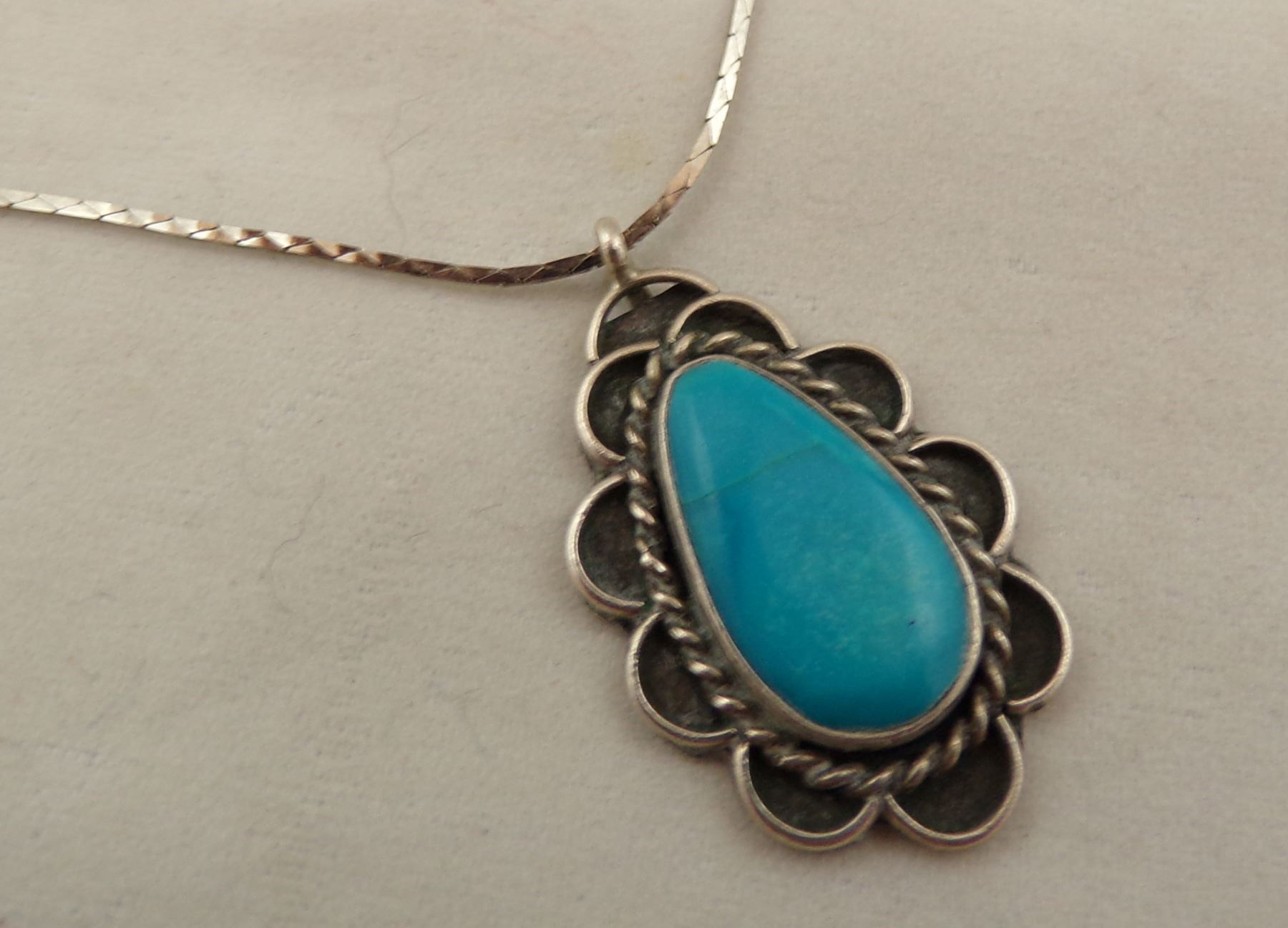 Vintage Native American Navajo Sterling Turquoise Pendant Necklace, pendant measures 1.25''L x 7/8''W, chain measures 17''L
