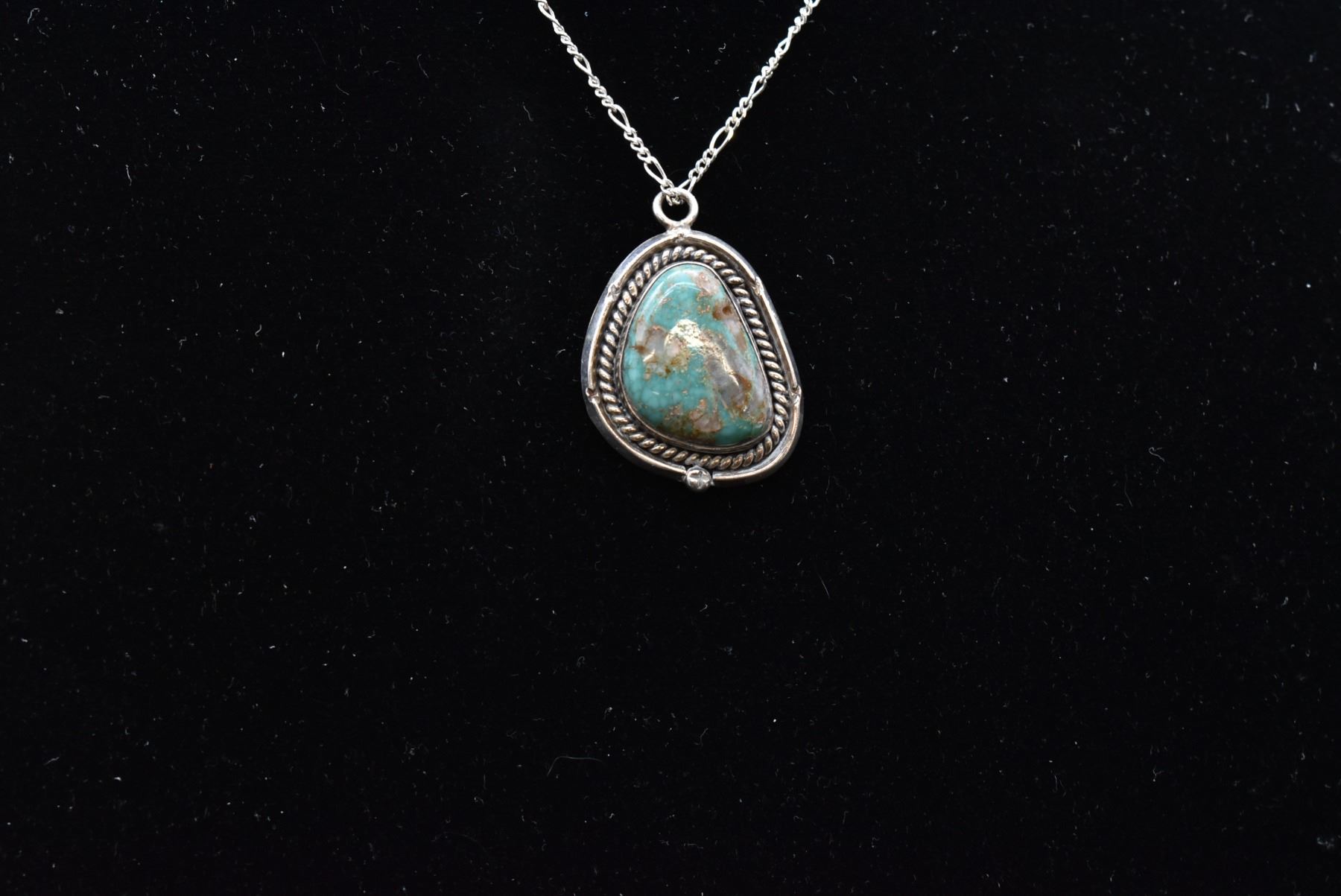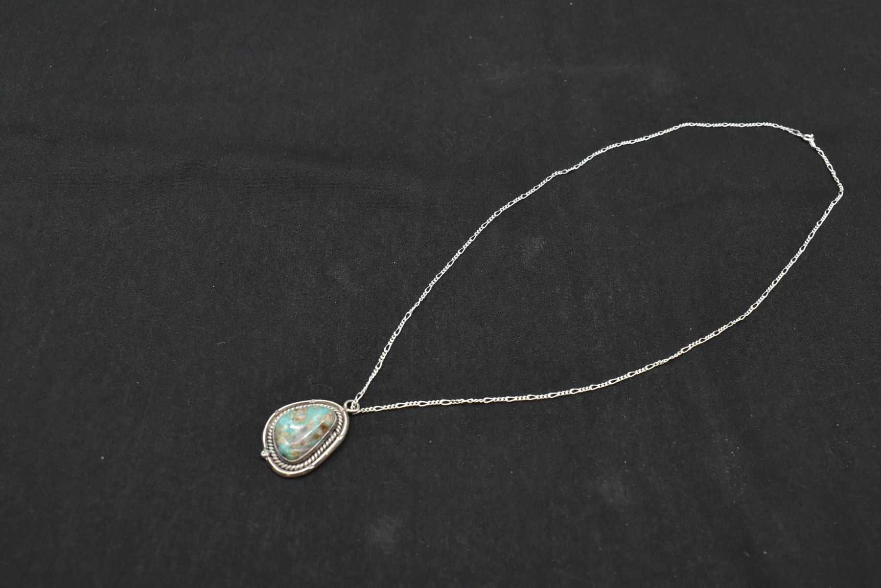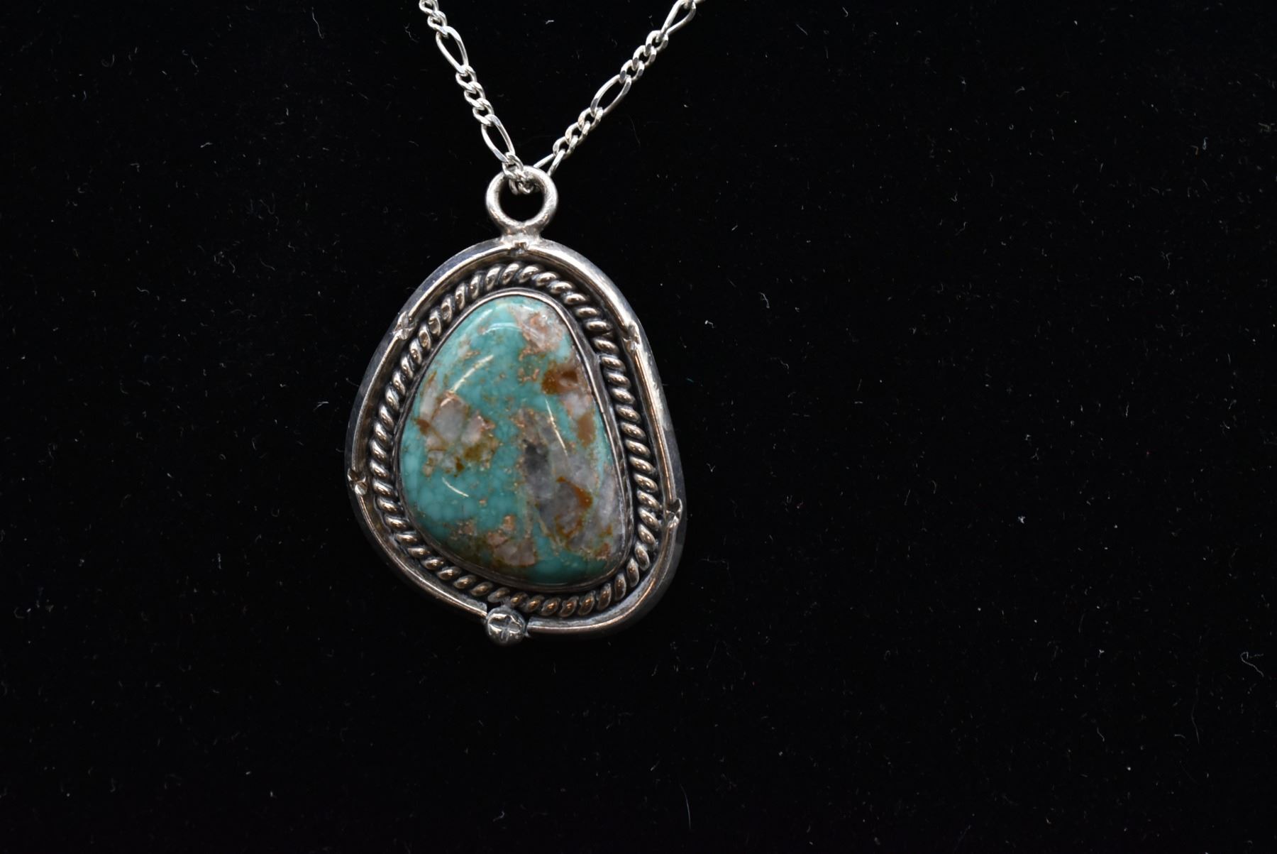 Vintage Native American Navajo Sterling Turquoise Pendant Necklace, pendant measures 1.25''L which includes the bale x 1''W, Italian sterling chain measures 22''L end to end and is marked Italy .925, total gram wt. of 15.3