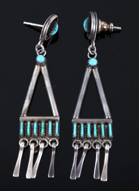 Featured in this lot we have a pair of Navajo Native American sterling silver and petite point turquoise earrings. The earrings each display eight pieces of sleeping beauty turquoise seven cut as petite points and the last one as a small cabochon. The top of the earring features a shadowbox set with a single piece of turquoise. The earrings show four silver tassels across the bottom just below the turquoise. The pieces are free of makers marks or signatures. The earrings show good condition overall with a warm patina. They measure 2 1/4" long by 1/2" wide.