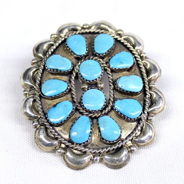 Navajo Sterling Turquoise Pin - Herman Vandever, measures approx. 2.25'' x 2''.  Can be worn as a Pin or Pendant.  There are twelve Cabochons measuring 3/8''L.