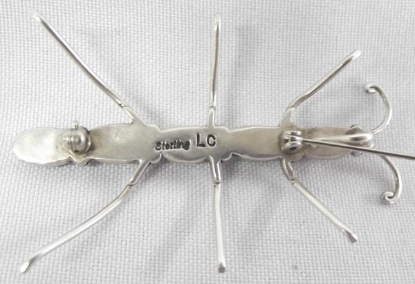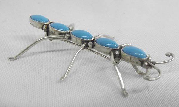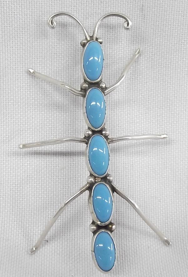Navajo Sterling Turquoise Ant Pin/Pendant by Lee Charley, hallmarked LC Sterling, ant features silver antennae and legs, 5 oval robin egg blue turquoise cabochons representing the head--thorax--abdomen, measures 2.5''L x 1.5''W